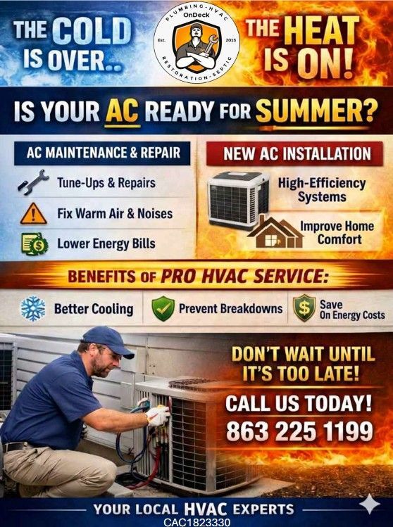At On Deck AC, we provide professional AC maintenance, air conditioning repair, and HVAC installation services designed to keep your home cool, energy-efficient, and comfortable all season long.